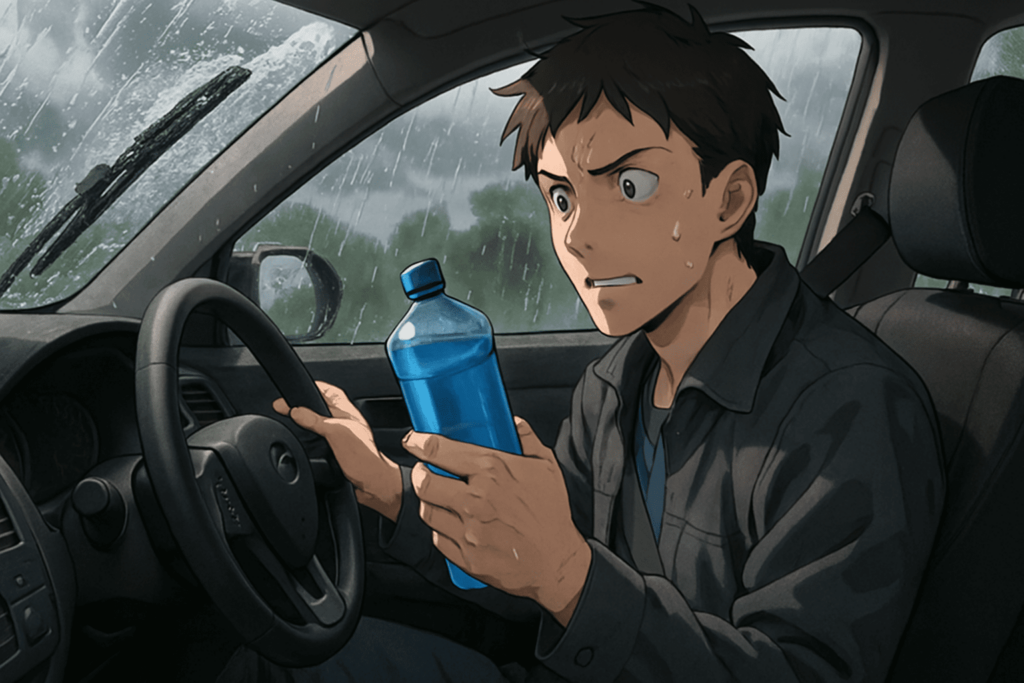 しかし、ウォッシャー液が切れているのに気づいたときの焦りは、まるで試験前の夜、勉強が足りていないときのようなものです。
